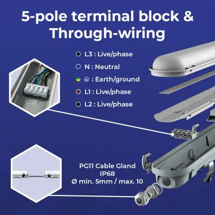 Descrizione Noxion Stagna LED Poseidon V3.0 30W 3900/4200lm - 830-865 CCT | 120cm - Cablaggio Entra/Esci (5x2.5mm2) - Sensore Di Movimento E Luce